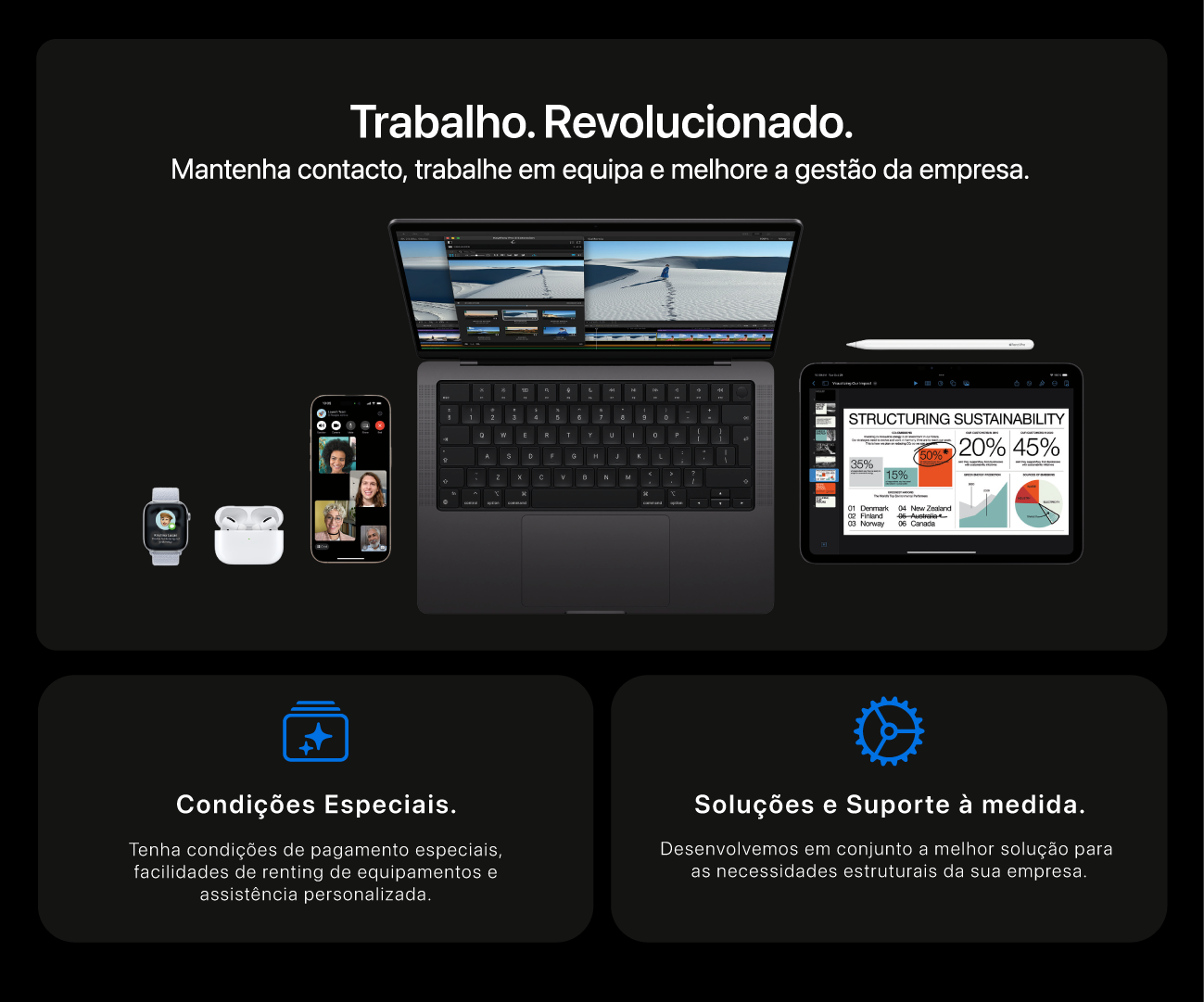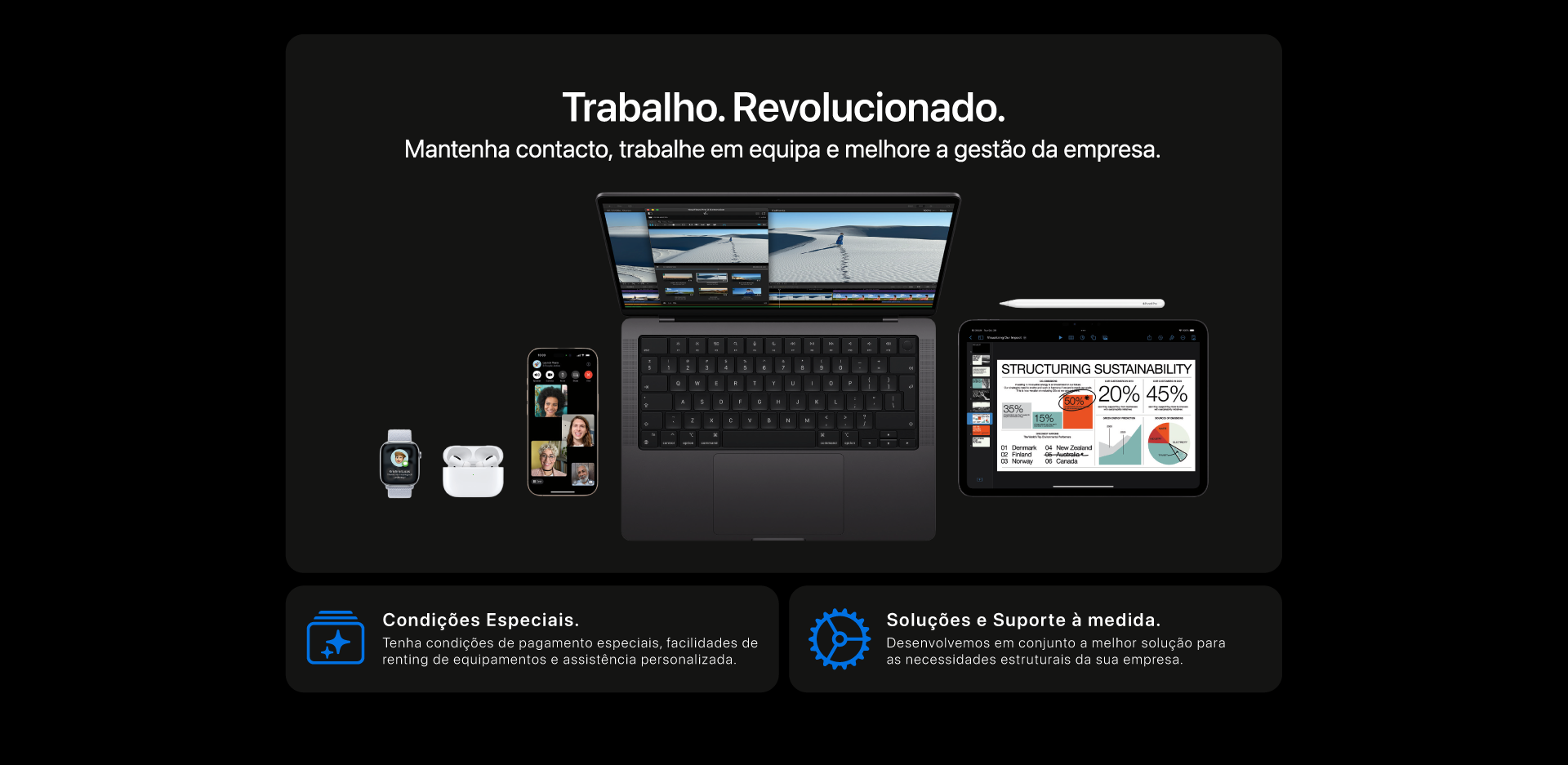 O hardware, software e serviços da Apple trabalham em conjunto para estimular a ligação, colaboração e criatividade das empresas.